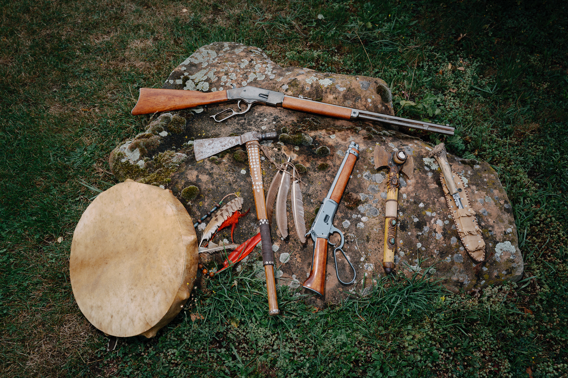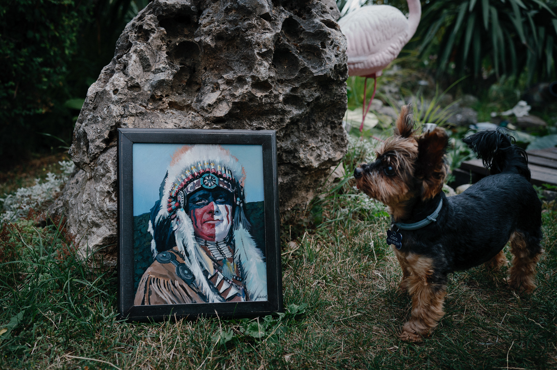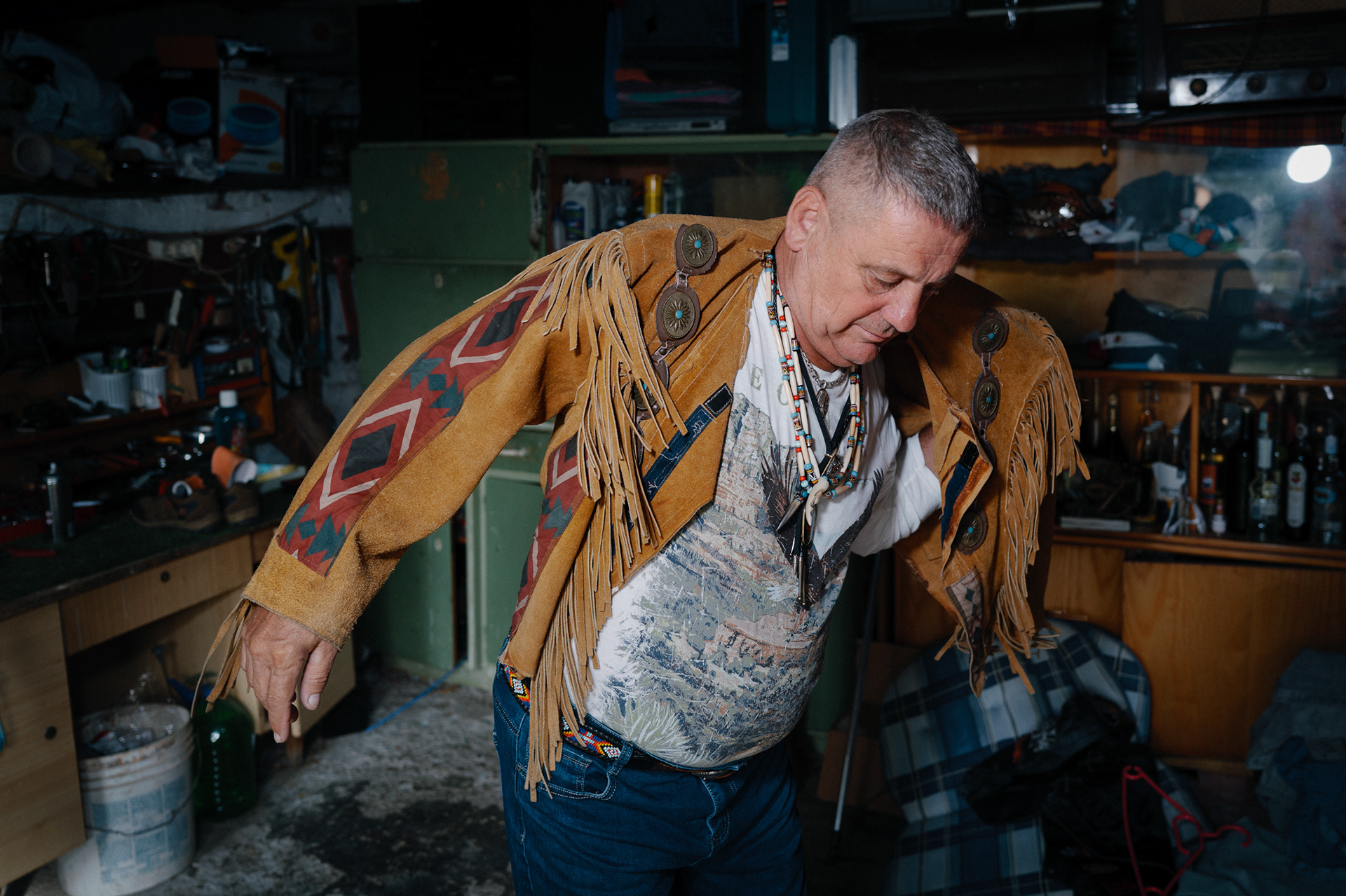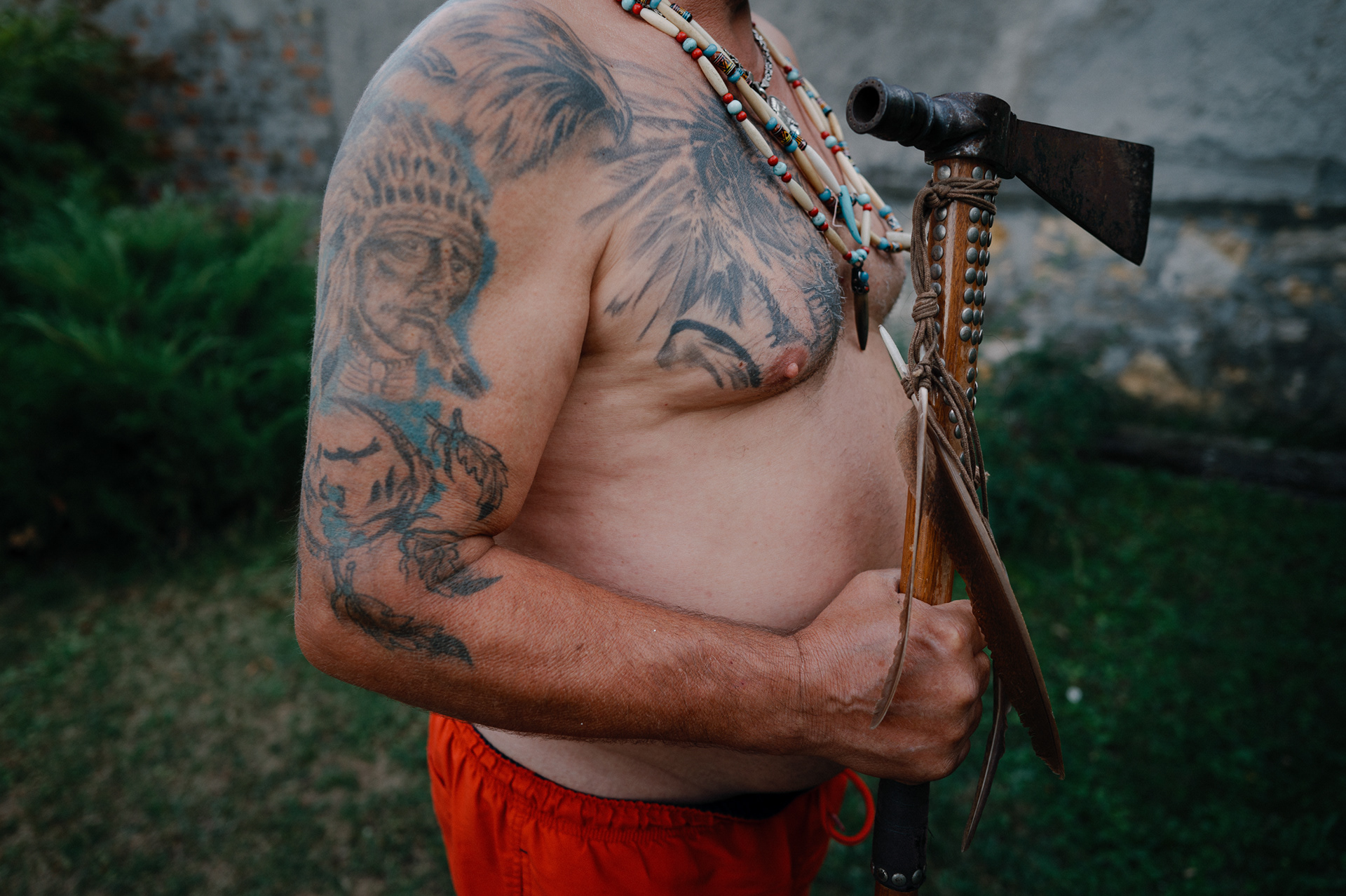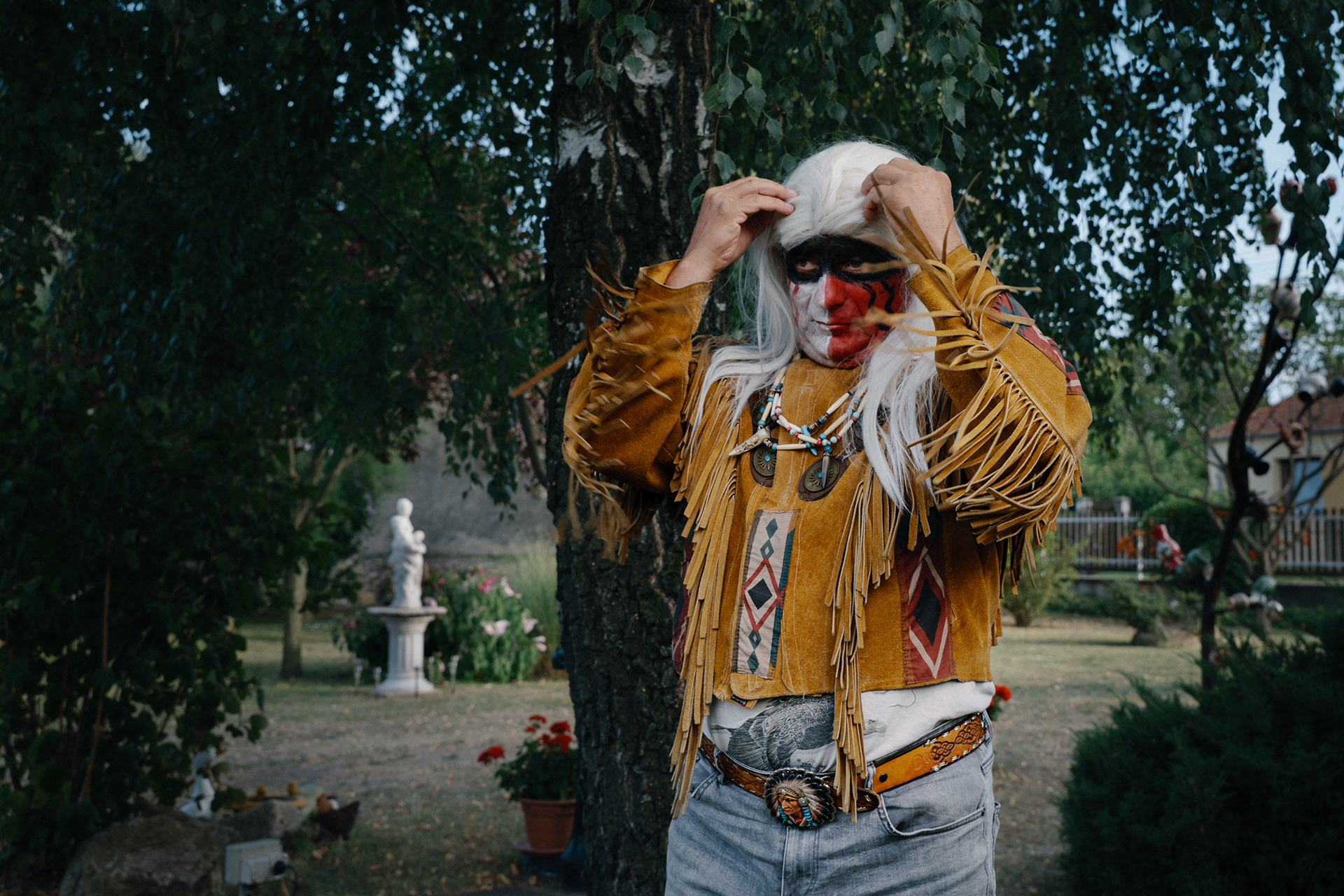 He crafts feathered headdresses, beadwork, and garments with careful attention; he collects replica weapons and rides a large chopper motorcycle; he grows and prepares herbs and restores old objects. His skin carries tattoos, including a portrait of Geronimo, whom he regards as a symbol of courage and resistance—the last free Apache warrior. When Tibor dresses in the attire he creates, sometimes painting his face as well, he is not performing. He is aligning himself with values he deeply admires: togetherness, resilience, wisdom, and a profound respect for nature.